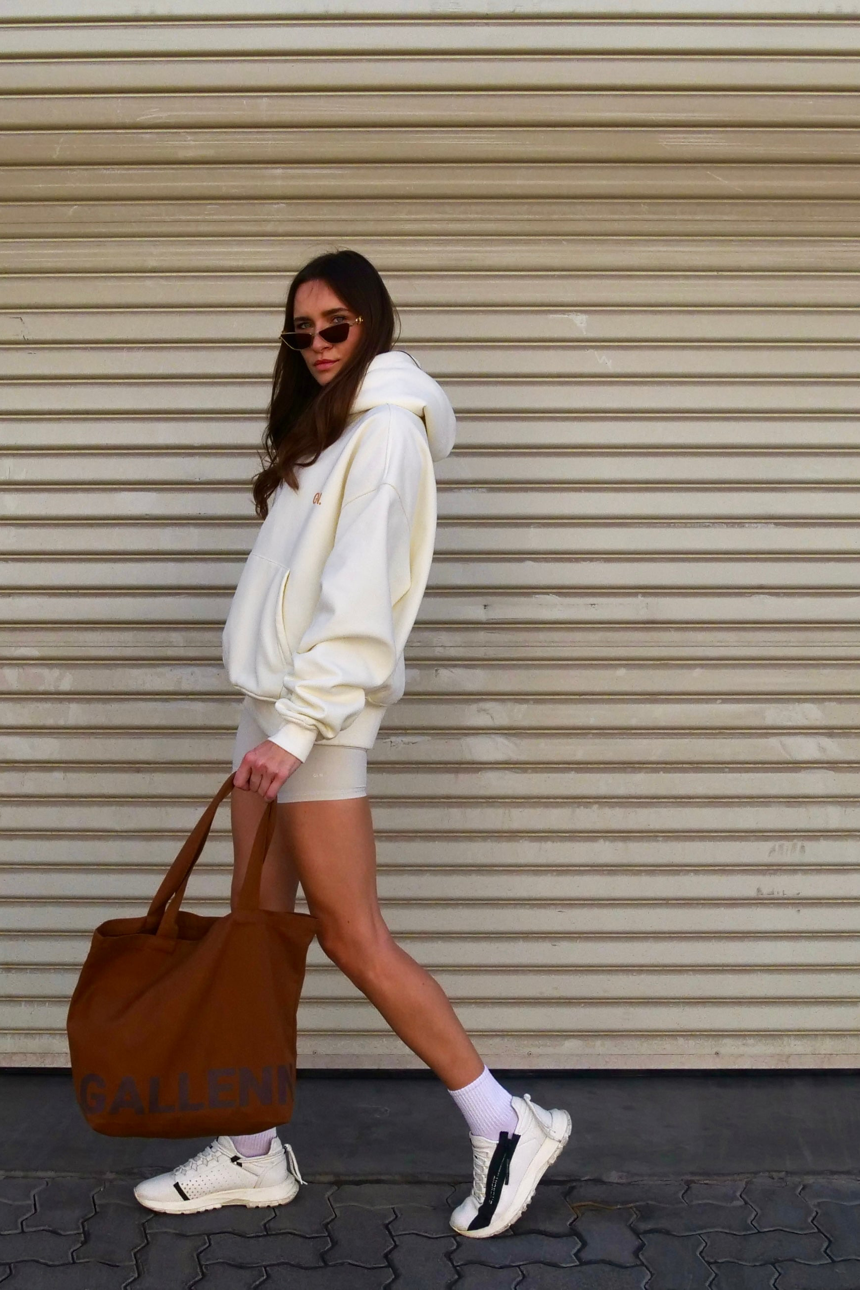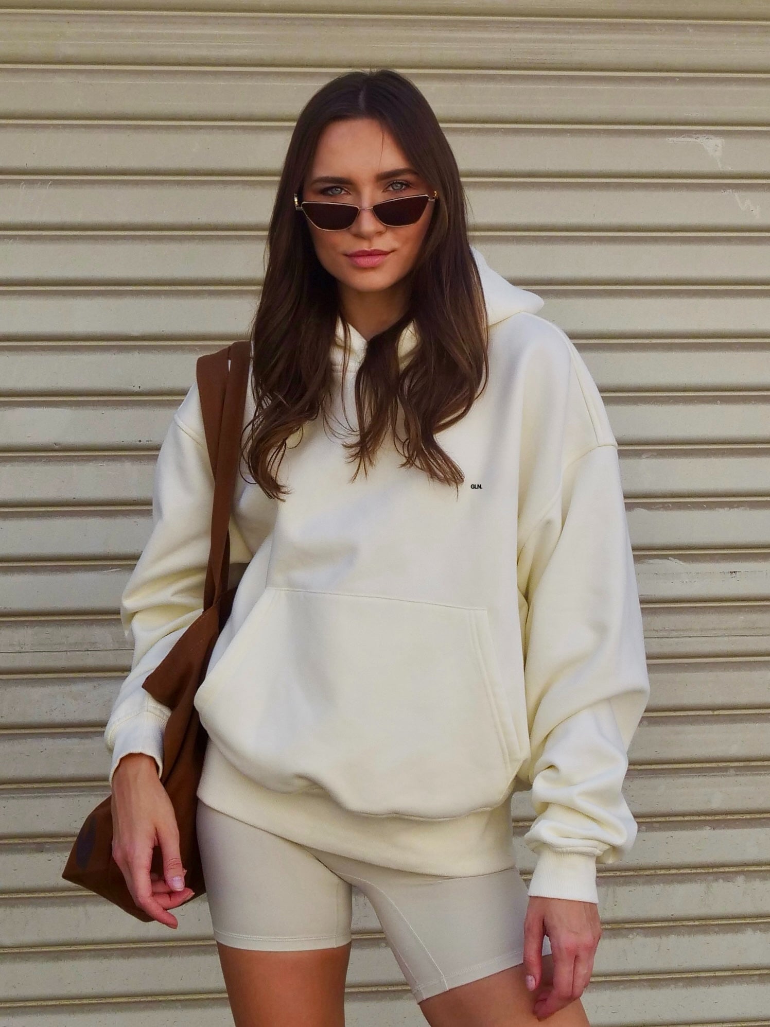 The Gallenn Essential Oversized Hoodie in light beige blends minimalist design with premium comfort. Crafted from a dense, ultra-soft fabric, it features a structured double-layer hood and a clean oversized silhouette with a slightly cropped length. Subtle branding and refined proportions make it a versatile piece, perfect for elevated everyday wear. A timeless essential for a modern, understated look