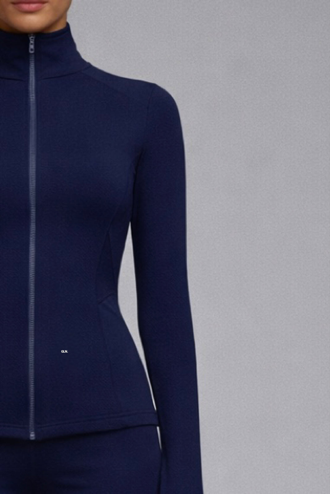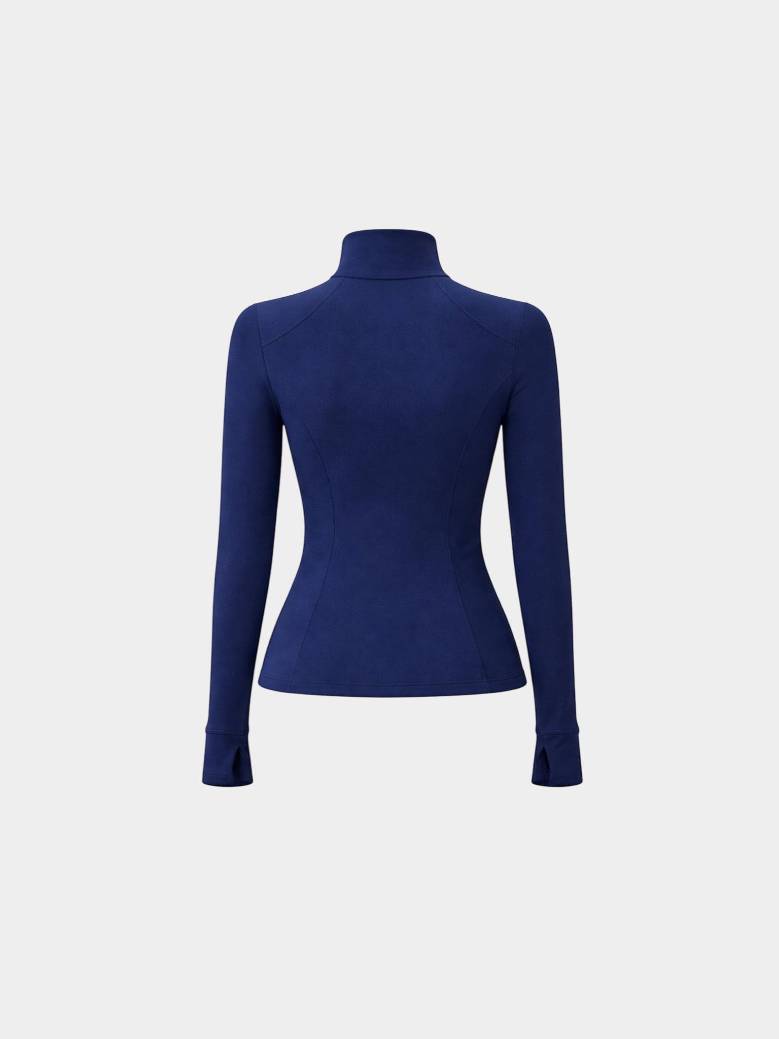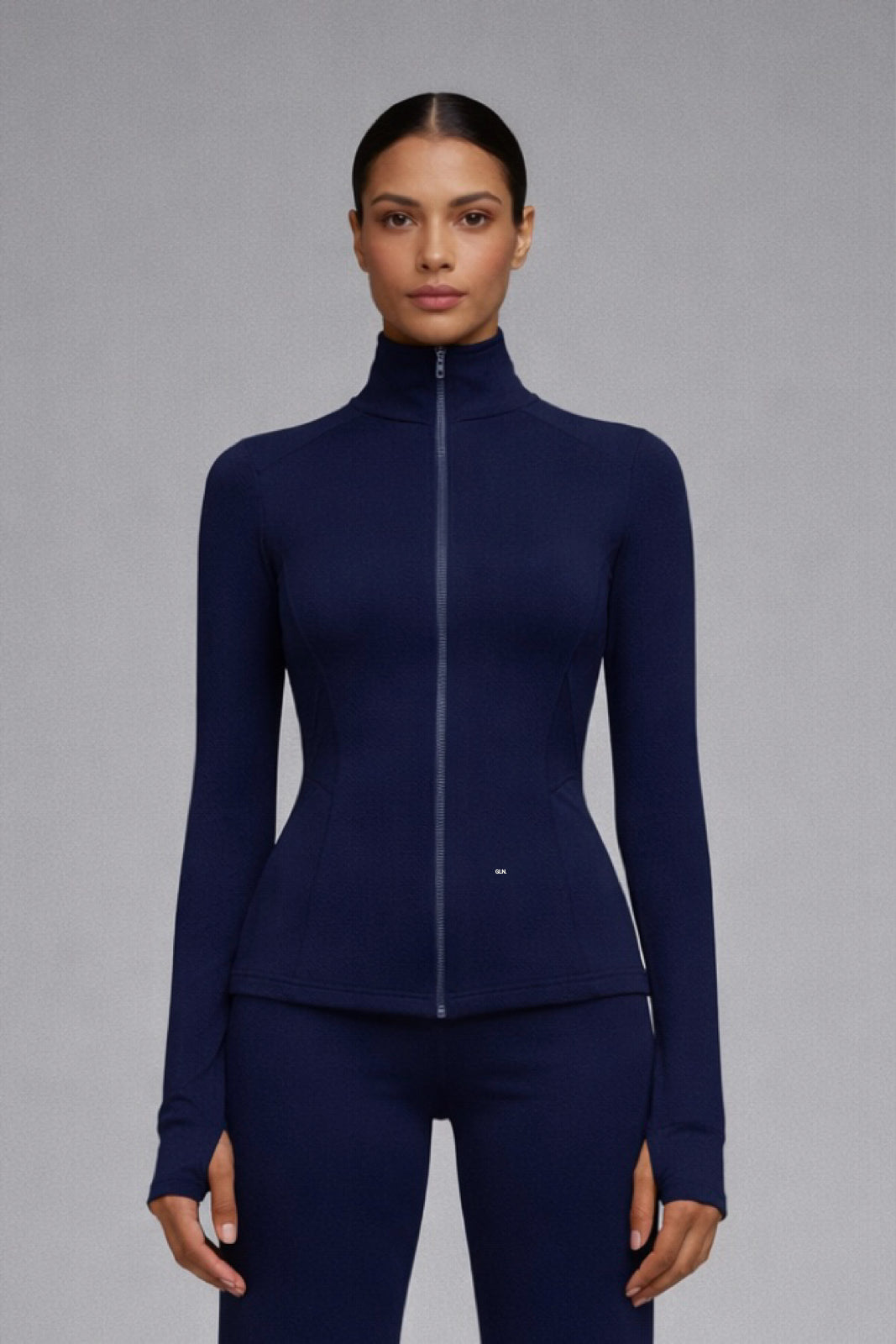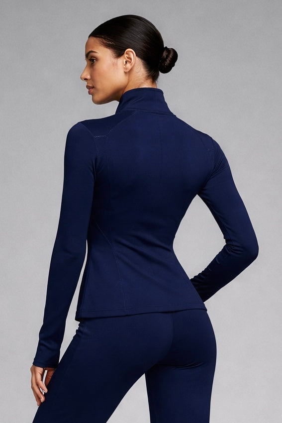 This navy blue jacket is designed as an essential layer for everyday movement. Its clean silhouette and structured fit create a balanced shape, both technical and refined. Crafted from a smooth, stretch fabric, it offers comfort and support without restricting motion. The high collar provides a sharp, modern line, while the full-length zipper allows adaptable wear.