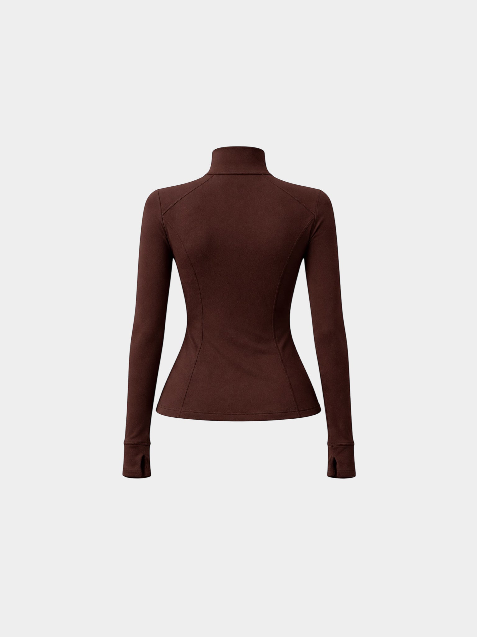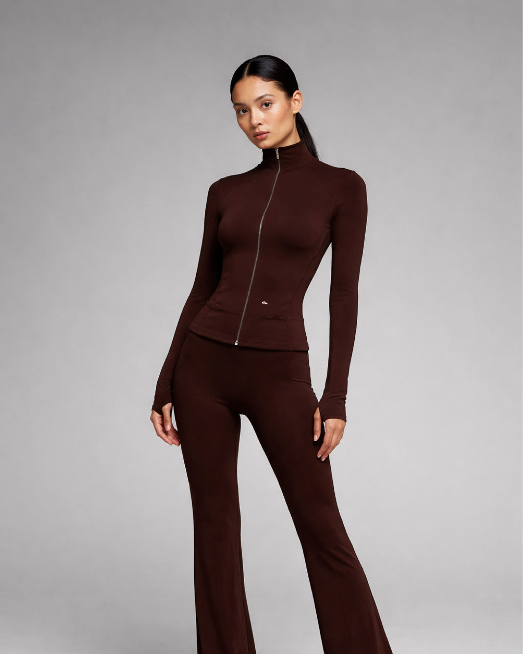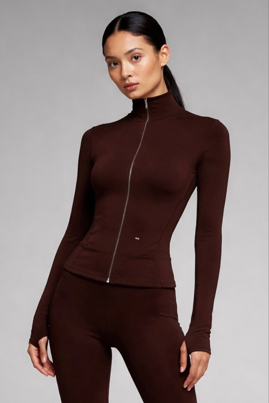 This coffee bean jacket is designed as an essential layer for everyday movement. Its clean silhouette and structured fit create a balanced shape, both technical and refined. Crafted from a smooth, stretch fabric, it offers comfort and support without restricting motion. The high collar provides a sharp, modern line, while the full-length zipper allows adaptable wear.